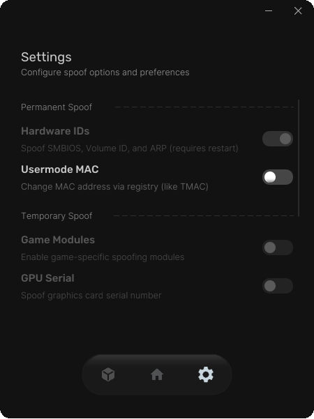Masks MAC addresses and network interface identifiers. Supports both permanent and usermode spoofing.
